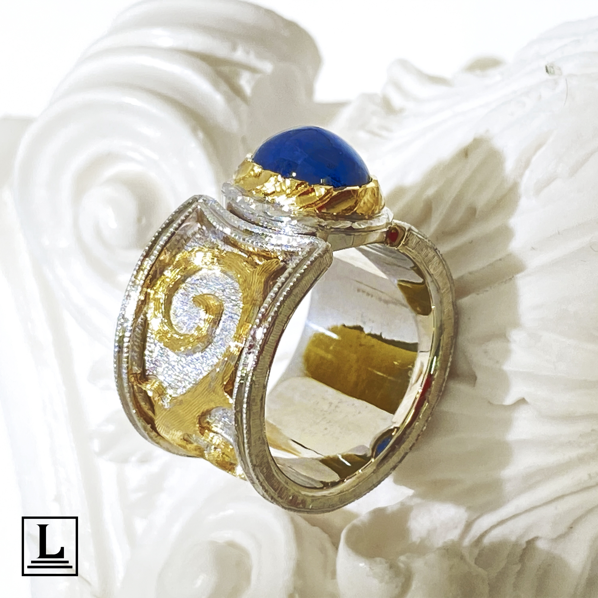 The Domus Aurea Collection is a project in continuous evolution. Initially conceived as a yellow gold band embellished with a cabochon sapphire, the collection has been enriched with bicolor versions, and subsequently with the refined hand-engraved finish. Each ring is adorned with selected gems and diamonds, which embellish the laurel wreath, a symbol of glory and beauty.